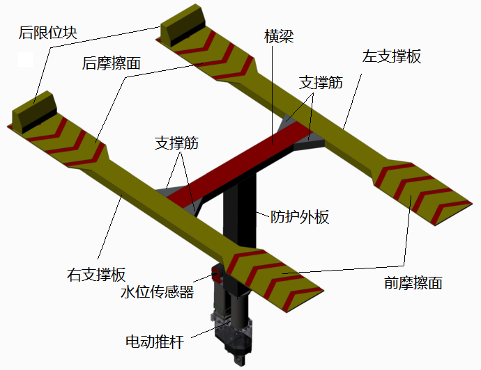 該套裝置能夠有效避免“水淹車”情況的出現(xiàn)。汽車??吭谧笥抑渭苌?,支撐架通過(guò)中間橫梁連接,下面設(shè)置有電動(dòng)推桿和水位傳感器,水位傳感器能夠?qū)崟r(shí)監(jiān)測(cè)車外水位情況,當(dāng)達(dá)到警戒水位時(shí),電動(dòng)推桿就夠驅(qū)動(dòng)整套架體的提升,避開水位。