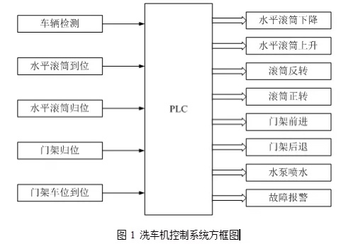設(shè)計(jì)方案:自動(dòng)洗車機(jī)由驅(qū)動(dòng)系統(tǒng)·機(jī)械系統(tǒng)·控制系統(tǒng)等組成。根據(jù)控制系統(tǒng)發(fā)出的指令,將來(lái)自電液壓和氣壓等各種能轉(zhuǎn)化為直線運(yùn)動(dòng)或旋轉(zhuǎn)運(yùn)動(dòng)的機(jī)械能的系統(tǒng),主要由機(jī)架導(dǎo)軌、頂刷擺臂、機(jī)構(gòu)小側(cè)刷、擺臂傳動(dòng)機(jī)構(gòu)大側(cè)刷,擺臂傳動(dòng)機(jī)構(gòu)、吹干系統(tǒng)和可編程控制器等組成。洗車機(jī)控制系統(tǒng)方框圖如下:
