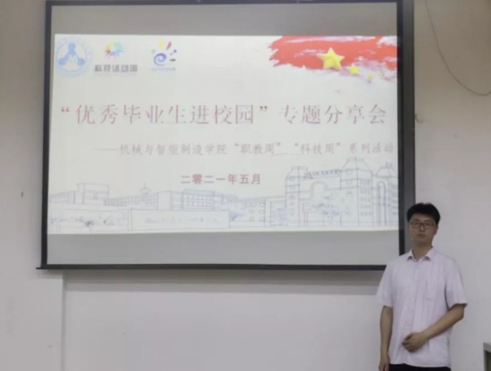 同日,為進(jìn)一步加強(qiáng)學(xué)風(fēng)建設(shè),調(diào)動(dòng)學(xué)生學(xué)習(xí)熱情,明確奮斗方向,我院于北區(qū)26號(hào)樓605室舉辦 “職教周”“科技周”系列活動(dòng)之“優(yōu)秀畢業(yè)生進(jìn)校園主題分享會(huì)”,邀請(qǐng)2011級(jí)機(jī)電一體化專(zhuān)業(yè)畢業(yè)生丁智文與在校學(xué)生做分享報(bào)告。丁智文從自身求學(xué)與工作經(jīng)歷出發(fā),與同學(xué)們交流了關(guān)于學(xué)習(xí)和工作的成長(zhǎng)心得,會(huì)上氣氛熱烈,同學(xué)們表示,此次分享會(huì)在一定程度上幫助他們找到三年大學(xué)生活的方向,引發(fā)了對(duì)人生和未來(lái)的深度思考,受益良多。
