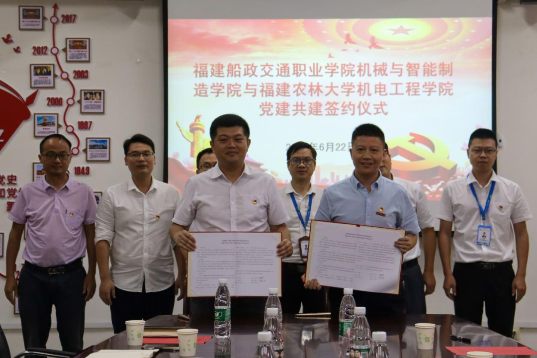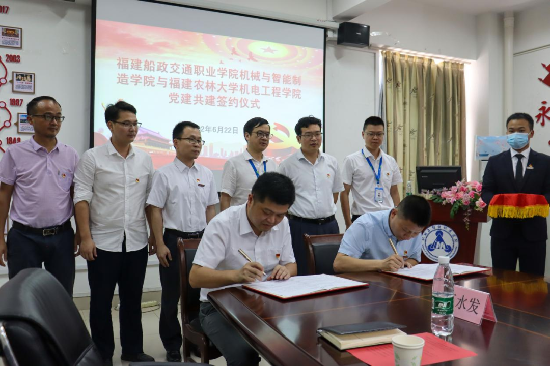 為進(jìn)一步提高我院基層黨組織凝聚力、戰(zhàn)斗力,不斷推動(dòng)我院的建設(shè)和發(fā)展,努力構(gòu)建“資源共享、優(yōu)勢互補(bǔ)、互相促進(jìn)、共同提高”的黨建工作新格局。2022年6月22日,福建船政交通職業(yè)學(xué)院機(jī)械與智能制造學(xué)院與福建農(nóng)林大學(xué)機(jī)電工程學(xué)院舉行黨建共建簽約儀式。