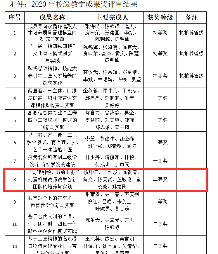根據(jù)《福建船政交通職業(yè)學(xué)院關(guān)于開(kāi)展2020年高等職業(yè)教育教學(xué)成果獎(jiǎng)評(píng)選工作的通知》,全校共申報(bào)20項(xiàng)教學(xué)成果,經(jīng)專(zhuān)家組評(píng)審,共評(píng)出特等獎(jiǎng)3個(gè),一等獎(jiǎng)4個(gè),二等獎(jiǎng)6個(gè)。我院《“黨建引領(lǐng),五維共振”交通機(jī)械教師教學(xué)創(chuàng)新團(tuán)隊(duì)的培養(yǎng)與實(shí)踐》獲校級(jí)教學(xué)成果二等獎(jiǎng)。