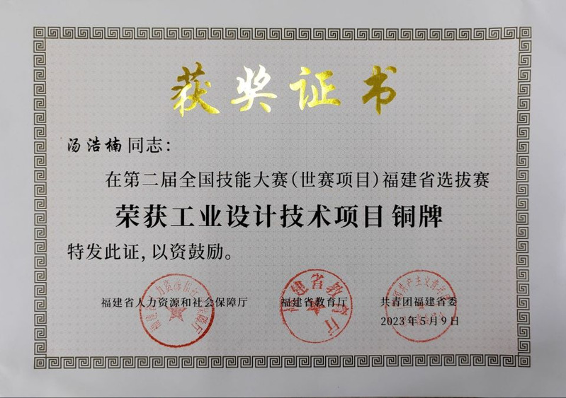 2023年3月7-9日,第二屆全國(guó)技能大賽福建省選拔賽“工業(yè)設(shè)計(jì)技術(shù)”賽項(xiàng)在漳州職業(yè)技術(shù)學(xué)院舉行,來(lái)自全省各高校12支代表隊(duì)參賽。經(jīng)過(guò)緊張激烈的比賽,我院程艷老師指導(dǎo)的湯浩楠同學(xué)榮獲銅獎(jiǎng)。