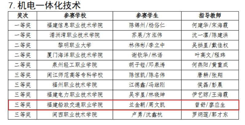 2023年12月23日-12月24日,福建省職業(yè)技能大賽“機(jī)電一體化”賽項(xiàng)在湄洲灣職業(yè)技術(shù)學(xué)院舉辦,來(lái)自全省的16支隊(duì)伍參賽。我院曾舒、廖應(yīng)生兩位老師指導(dǎo)的蘭金朝、周文凱同學(xué)獲得三等獎(jiǎng)。