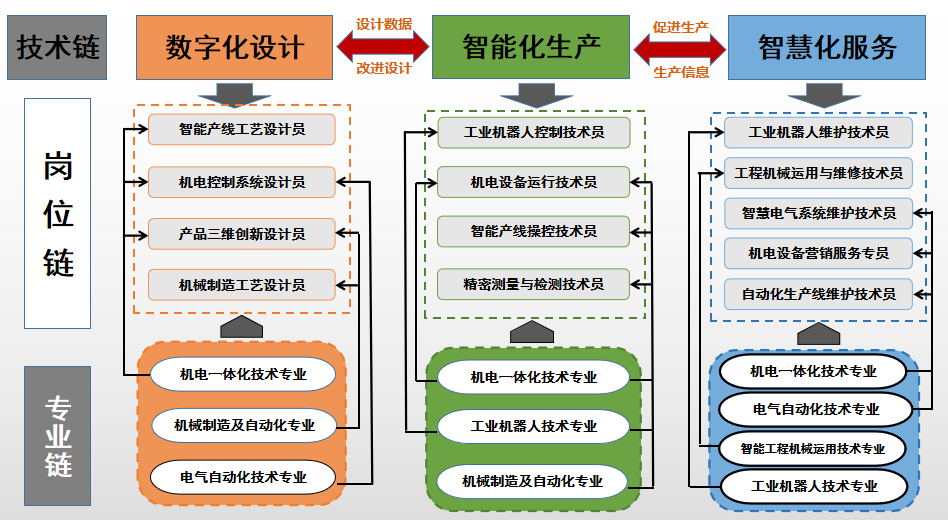 全面對(duì)接“中國(guó)制造2025”、“數(shù)控一代”、“智能制造”等國(guó)家、福建省重大戰(zhàn)略,培養(yǎng)交通機(jī)械制造的高端復(fù)合型人才、輸出技術(shù)服務(wù)、支撐中小微制造業(yè)企業(yè)轉(zhuǎn)型升級(jí)。專業(yè)群聚焦先進(jìn)制造業(yè)發(fā)展對(duì)福建省機(jī)電產(chǎn)業(yè)高端的人才需求,圍繞數(shù)字化設(shè)計(jì)→智能化生產(chǎn)→智慧化服務(wù)技術(shù)鏈,覆蓋了工程機(jī)械與制造領(lǐng)域的數(shù)字化設(shè)計(jì)、智能制造、工業(yè)機(jī)器人、智能制造控制技術(shù)等關(guān)鍵技術(shù)領(lǐng)域技能型人才培養(yǎng),實(shí)現(xiàn)了工程機(jī)械等高端機(jī)電工業(yè)產(chǎn)品從“前端設(shè)計(jì)、中端制造、末端服務(wù)”的生命全周期管理,同時(shí)末端服務(wù)信息可以改進(jìn)設(shè)計(jì)、促進(jìn)生產(chǎn)。專業(yè)鏈與崗位鏈、技術(shù)鏈高度契合,如圖1所示。