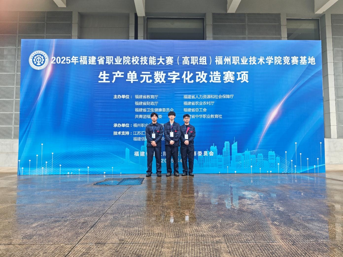 2025年4月9日至10日,福建省職業(yè)院校技能大賽(高職組)“生產(chǎn)單元數(shù)字化改造”賽項在福州職業(yè)技術(shù)學(xué)院舉行,機械與智能制造學(xué)院嚴(yán)仕先和鄭曉輝老師指導(dǎo)蔡景燁、趙啟承和陳騁組成的代表隊榮獲三等獎。在賽場上,他們憑借深厚的專業(yè)功底與默契無間的團(tuán)隊協(xié)作,將我院學(xué)子精益求精、密益求密的精神風(fēng)貌展現(xiàn)得淋漓盡致。