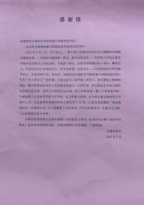 5月3日,福州市長樂區(qū)古槐鎮(zhèn)嶼頭湖游船上一兒童腳下踩空,不慎落水。機(jī)械與智能制造學(xué)院2023級(jí)智能工程機(jī)械運(yùn)用技術(shù)2班林佳星同學(xué)正在此游船上看風(fēng)景,聽到呼救聲后,他立即挺身而出,毫不猶豫跳入湖中將落水的女童成功救起。