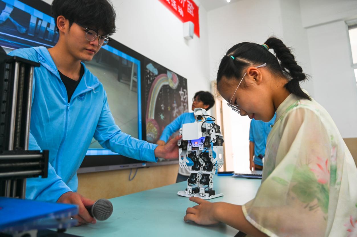 (小朋友在實(shí)踐團(tuán)成員的幫助下學(xué)習(xí)操作人形機(jī)器人)