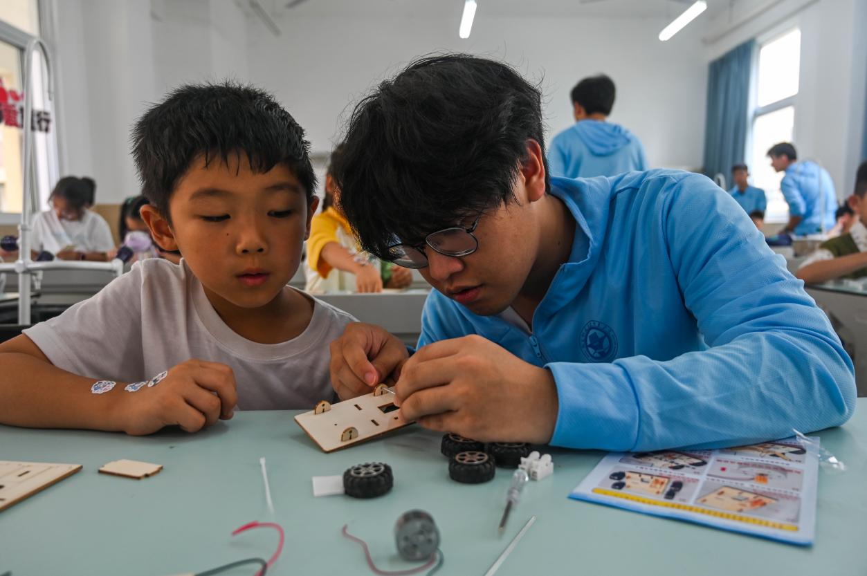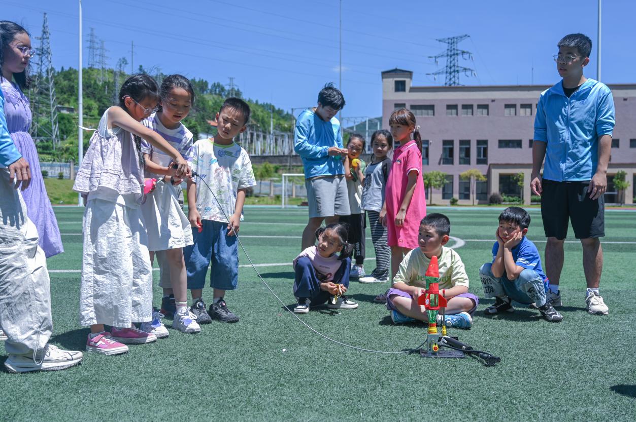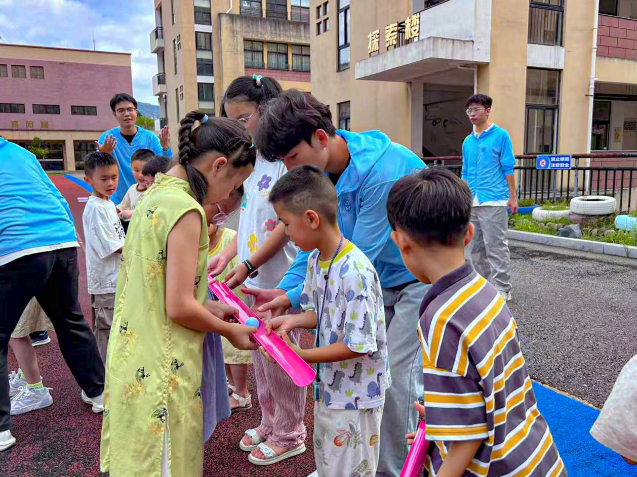 (實(shí)踐團(tuán)成員指導(dǎo)小朋友們制作火箭發(fā)射器)