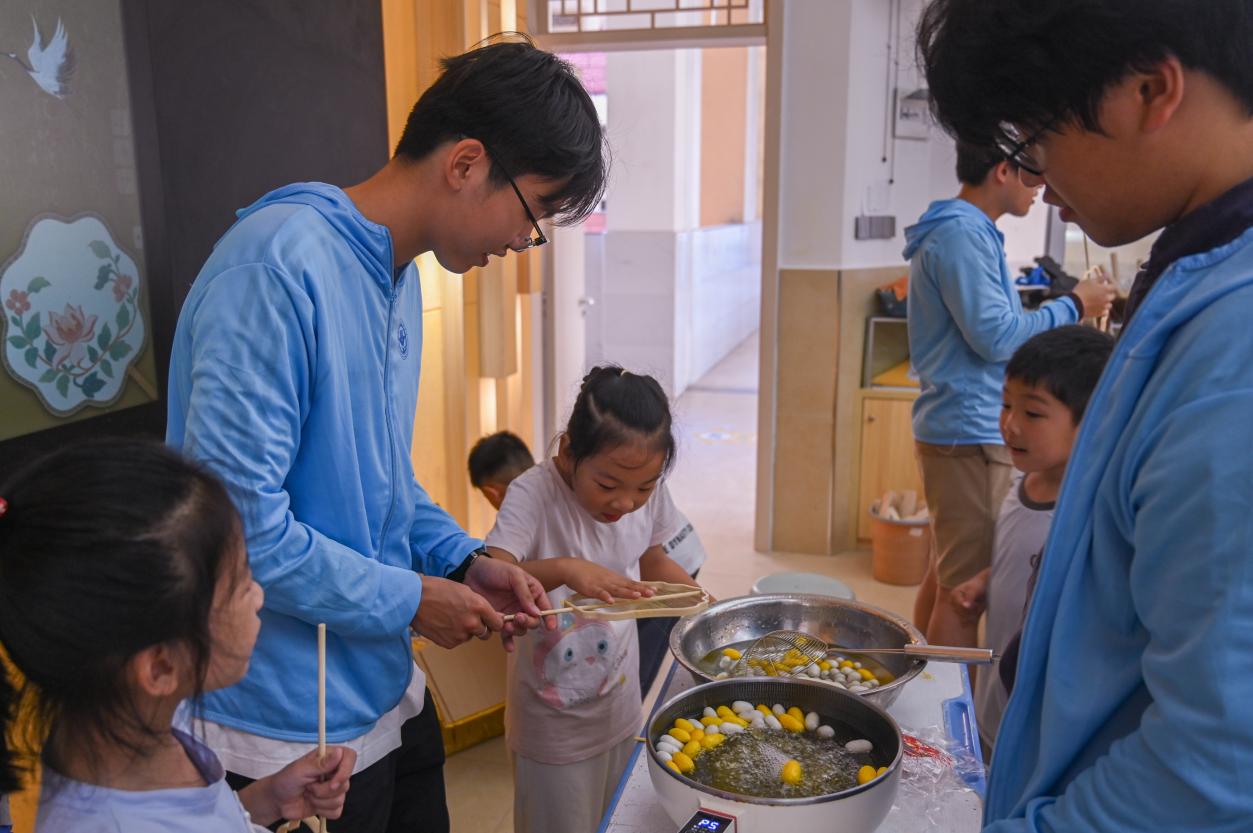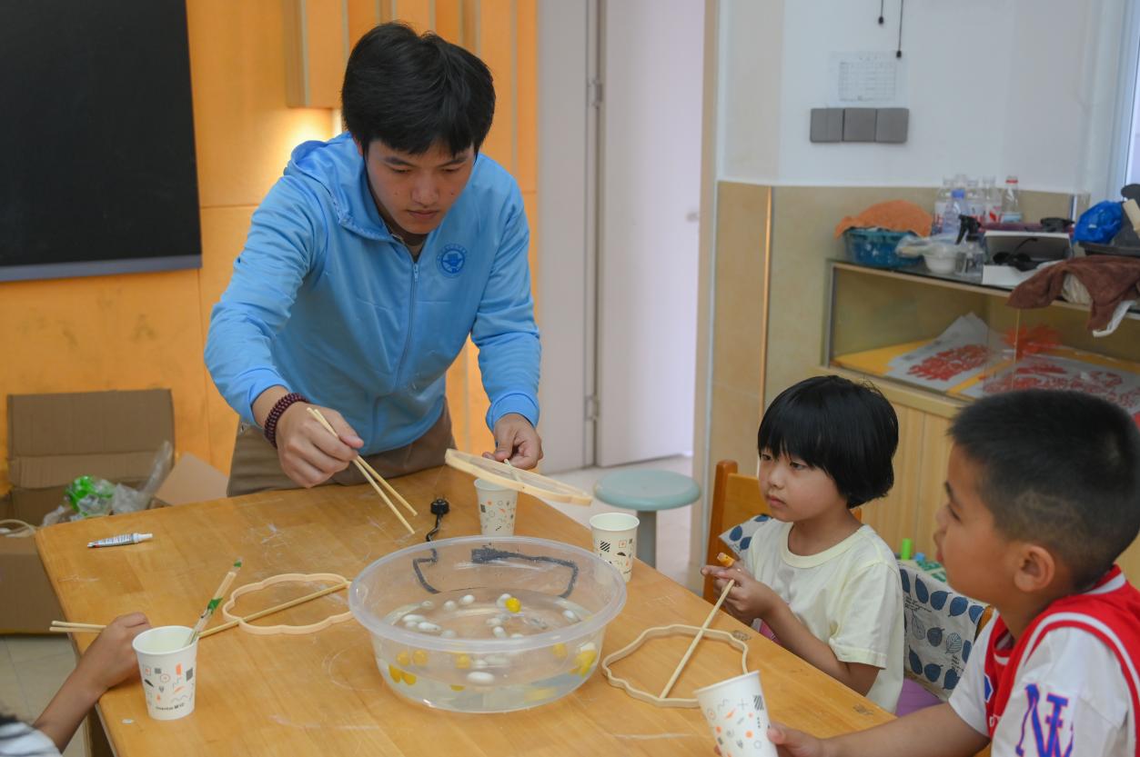 (實(shí)踐團(tuán)成員給小朋友們上非遺蠶絲扇課堂)