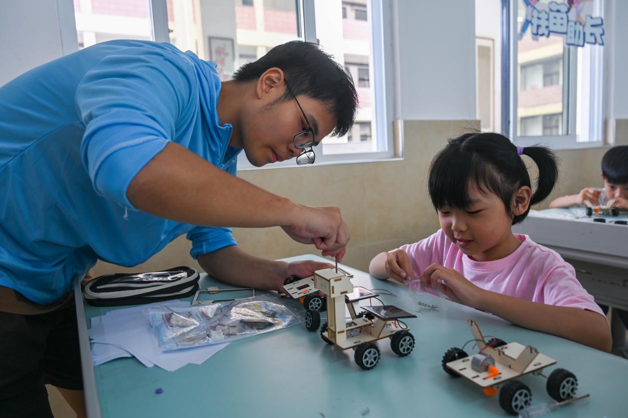(實(shí)踐團(tuán)成員指導(dǎo)小朋友們制作“月球車”)