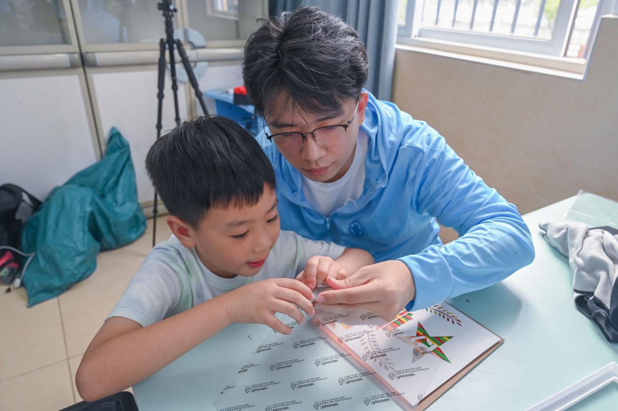 (實(shí)踐團(tuán)成員指導(dǎo)小朋友們制作蠶絲扇)