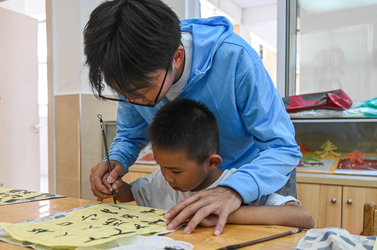 (實(shí)踐團(tuán)成員指導(dǎo)小朋友們寫書法)