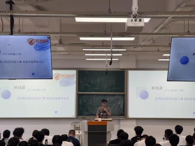 2025年世界技能大賽金獎(jiǎng)獲得者、我院23級(jí)工業(yè)機(jī)器人專業(yè)學(xué)生林煒晨分享了他的備賽歷程與成長(zhǎng)體會(huì)。他提到,在機(jī)器人競(jìng)賽團(tuán)隊(duì)中系統(tǒng)性的訓(xùn)練,包括編程、算法學(xué)習(xí)與機(jī)器人反復(fù)拆裝等實(shí)戰(zhàn)內(nèi)容,不僅極大提升了其專業(yè)技能,更讓他明確了職業(yè)方向。他鼓勵(lì)新生充分了解學(xué)校提供的競(jìng)賽激勵(lì)政策,積極參與課外興趣小組,全面提升綜合能力。