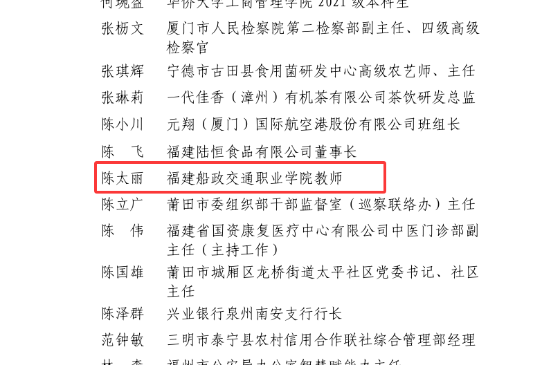 近日,共青團福建省委公示2025年度福建青年五四獎?wù)?、福建新時代青年先鋒、福建省五四紅旗團委(團支部)、福建省優(yōu)秀共青團員、福建省優(yōu)秀共青團干部表彰對象。我院教師陳太麗獲評“2025年度福建省新時代青年先鋒”榮譽稱號,特此祝賀!