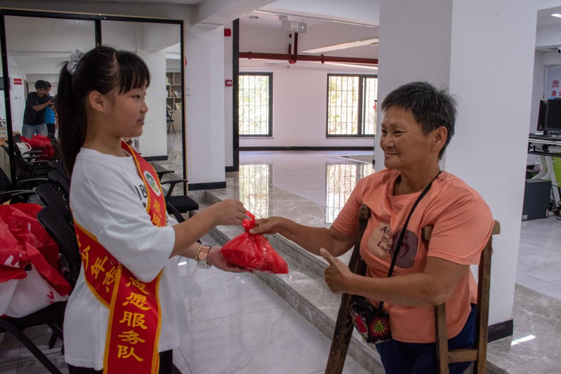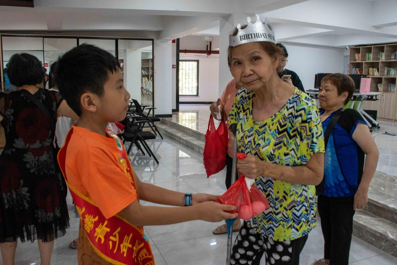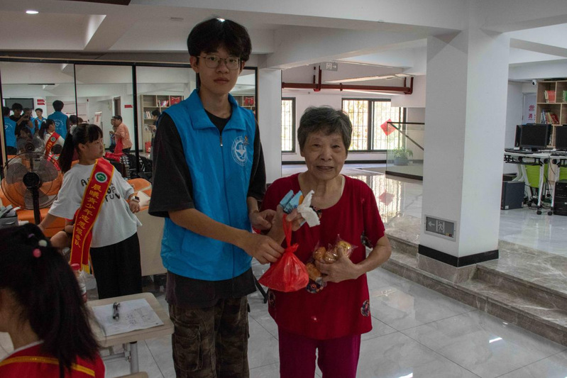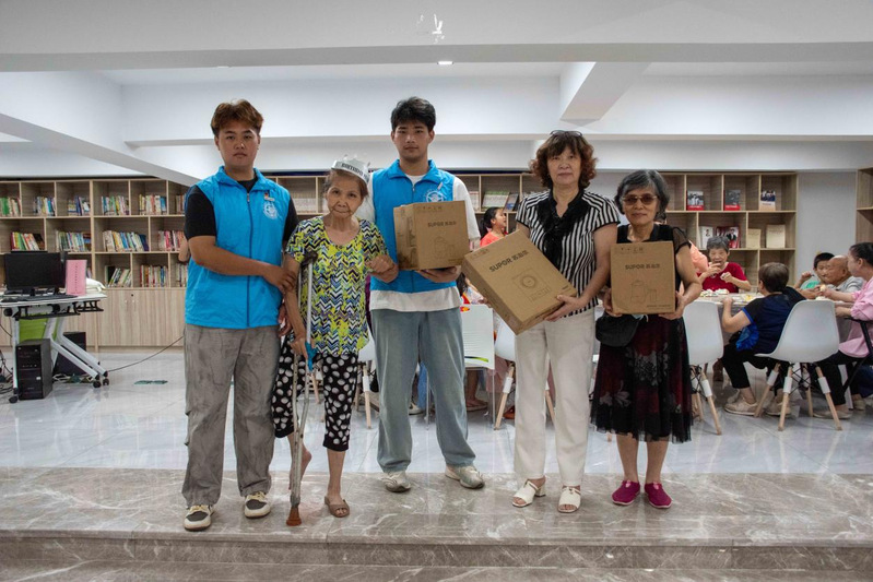 活動(dòng)接近尾聲,志愿者們將愛心禮物一一送到老人手中。禮物雖不貴重,卻飽含心意。學(xué)生們俯身與老人交談,傾聽他們的故事,擁抱告別。