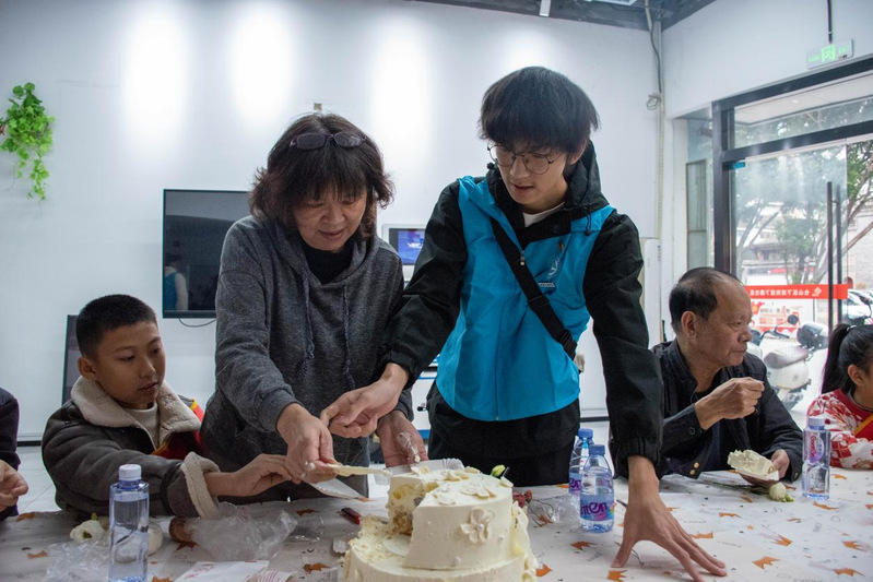文藝表演結(jié)束后,志愿者們推著精心準(zhǔn)備的祝福蛋糕緩緩入場,點(diǎn)亮象征吉祥安康的蠟燭。伴隨著全場齊唱的溫馨生日歌,長者們閉上眼睛許下美好心愿。志愿者們細(xì)心地將蛋糕切塊分裝,逐一送到每位老人手中,蹲在老人身邊陪伴他們品嘗甜蜜滋味,輕聲交流家常,讓老人們在歡聲笑語中感受家人般的關(guān)懷。