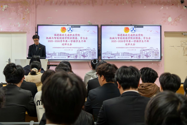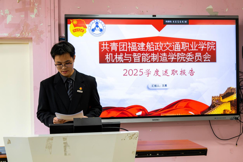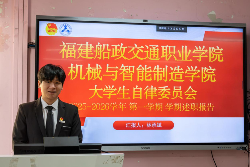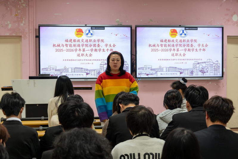 2026年1月7日,共青團(tuán)福建船政交通職業(yè)學(xué)院機(jī)械與智能制造學(xué)院委員會(huì)兩委學(xué)生干部述職總結(jié)大會(huì)在福道園2號(hào)樓1-3教室順利召開(kāi),本次會(huì)議旨在全面總結(jié)2025-2026學(xué)年第一學(xué)期學(xué)生工作成效、查擺問(wèn)題不足,科學(xué)謀劃新學(xué)期工作計(jì)劃,進(jìn)一步提升學(xué)生工作的凝聚力與執(zhí)行力,不斷強(qiáng)化學(xué)生干部隊(duì)伍的責(zé)任擔(dān)當(dāng)與服務(wù)意識(shí),切實(shí)提升服務(wù)同學(xué)成長(zhǎng)成才的能力水平。學(xué)院黨總支書(shū)記朱寶杉、院分團(tuán)委書(shū)記鄭茜、院分團(tuán)委副書(shū)記華銀、院分團(tuán)委組織委員楊榕、院分團(tuán)委宣傳委員官蕾及輔導(dǎo)員林婷出席會(huì)議,會(huì)議由院分團(tuán)委兼職副書(shū)記(學(xué)生)王晨主持。
