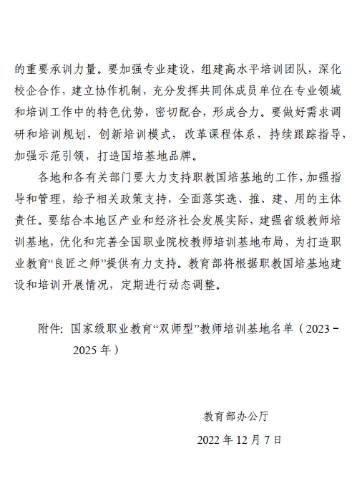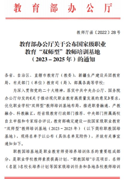 12月7日,教育部辦公廳公布國家級(jí)職業(yè)教育“雙師型”教師培訓(xùn)基地名單(2023-2025年),我校申報(bào)的交通運(yùn)輸大類道路運(yùn)輸中類“雙師型”教師培訓(xùn)基地成功入選國家級(jí)職業(yè)教育“雙師型”教師培訓(xùn)基地。