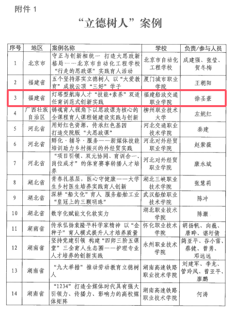 近日,中國職業(yè)技術(shù)教育學會發(fā)布《關(guān)于公布職業(yè)教育“立德樹人”、解決產(chǎn)業(yè)發(fā)展問題、“職教出海”、非遺成果轉(zhuǎn)化案例名單的通知》,我院報送的《燈塔型航海人才“技能+素養(yǎng)”雙適任育訓范式創(chuàng)新實踐》《古船新造:福船非遺技藝的創(chuàng)造性轉(zhuǎn)化與職業(yè)教育賦能的活態(tài)創(chuàng)新模式》分別入選“立德樹人”和“非遺成果轉(zhuǎn)化”典型案例。