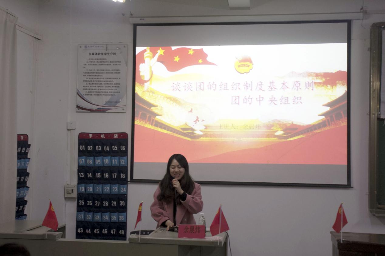 團(tuán)課上輔導(dǎo)員余晨煒老師向同學(xué)們講述了團(tuán)的組織制度基本原則,并重點(diǎn)講述了民主集中制