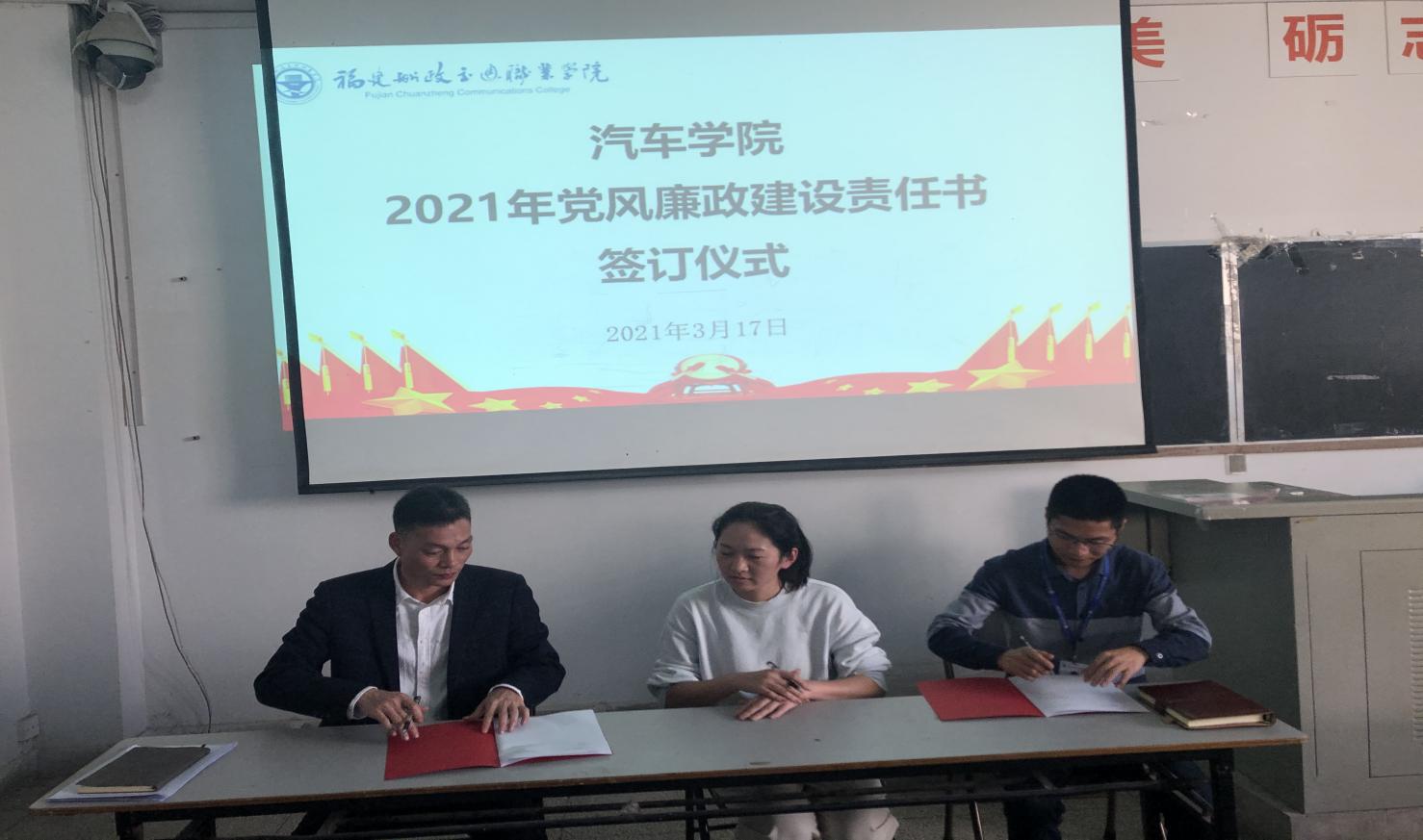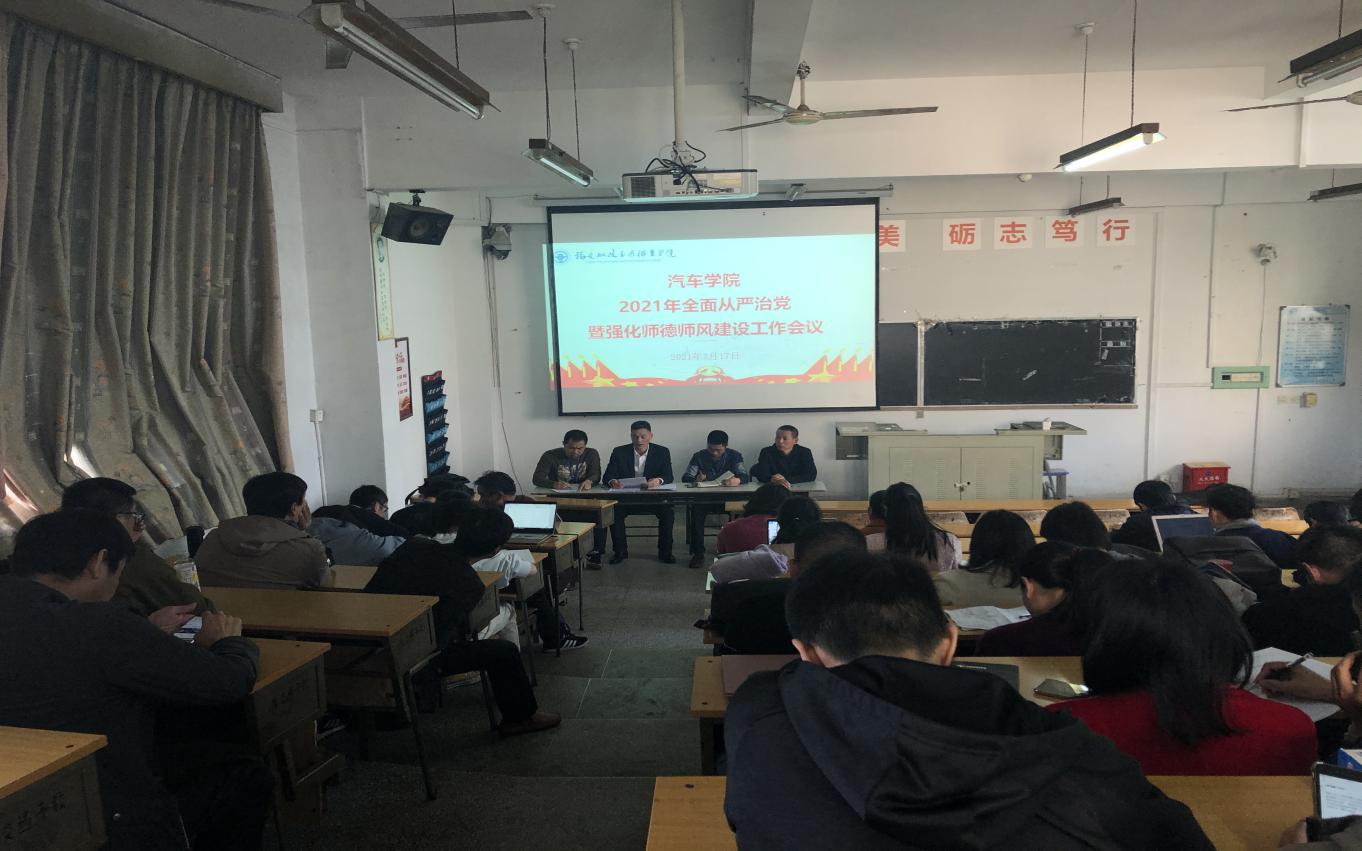 2021年3月17日下午,汽車學院召開2021年深化全面從嚴治黨暨強化師德師風建設工作部署會,并舉行黨風廉政責任書簽訂儀式。汽車學院黨總支蔡華錦書記主持會議,全體班子成員、黨員領(lǐng)導干部和教職工參加了會議。