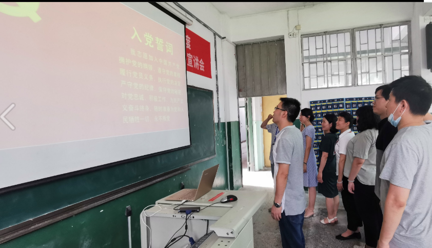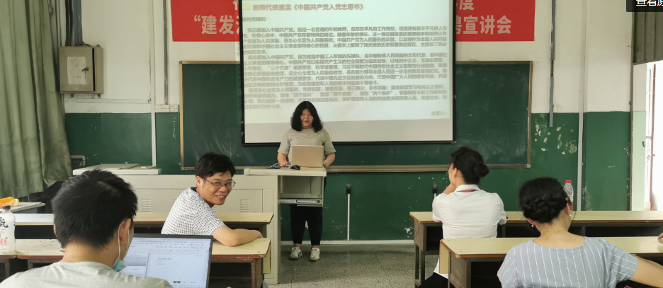 為了迎接黨的100周歲生日,由支部書(shū)記朱劍寶同志帶領(lǐng)大家重溫入黨誓詞,本支部最年輕的黨員黃丹粟同志作為青年教師代表重溫入黨志愿書(shū)。拉開(kāi)了本次學(xué)習(xí)活動(dòng)的序幕。與往常不同的開(kāi)場(chǎng)方式將本次學(xué)習(xí)活動(dòng)推向一個(gè)小高潮,充分調(diào)動(dòng)了黨員學(xué)習(xí)的熱情。