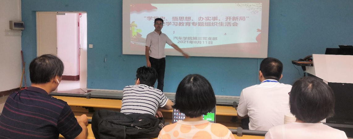 2021年8月11日,汽車學(xué)院第三黨支部根據(jù)上級(jí)黨組織通知要求,圍繞“學(xué)黨史、悟思想、辦實(shí)事、開(kāi)新局”主題,認(rèn)真貫徹“學(xué)史明理、學(xué)史增信、學(xué)史崇德、學(xué)史力行”要求,組織三支部全體黨員召開(kāi)黨史學(xué)習(xí)教育專題組織生活會(huì)。