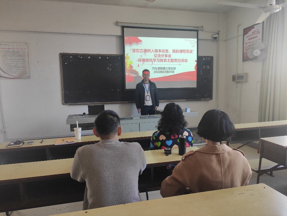 依據(jù)習(xí)近平新時(shí)代中國(guó)特色社會(huì)主義思想,深入貫徹落實(shí)全國(guó)、全省高校思想政治工作會(huì)議精神,落實(shí)立德樹(shù)人根本任務(wù),做好“思政課程”和“課程思政”教育教學(xué)改革,充分發(fā)揮課堂教學(xué)主渠道育人作用。2022年3月9日,汽車(chē)學(xué)院第三黨支部在北區(qū)8#221教室組織開(kāi)展了“落實(shí)立德樹(shù)人根本任務(wù),我的課程思政”交流分享會(huì)主題黨日活動(dòng),活動(dòng)由汽車(chē)學(xué)院第三黨支部書(shū)記朱劍寶主持。