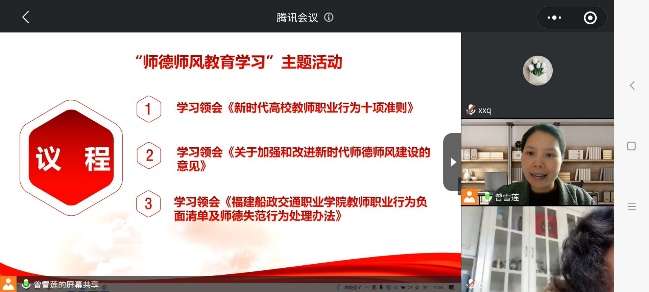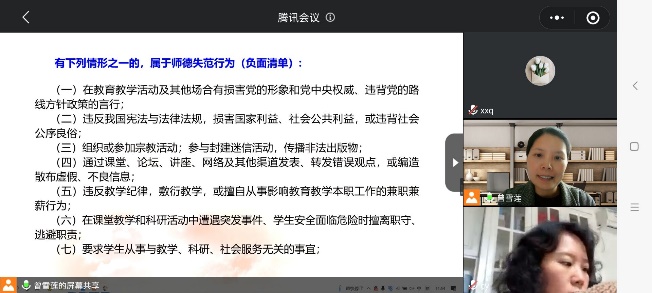 為貫徹落實(shí)習(xí)近平總書記關(guān)于教育的重要論述,貫徹落實(shí)師德師風(fēng)第一標(biāo)準(zhǔn),建設(shè)政治素質(zhì)過硬、業(yè)務(wù)能力精湛、育人水平高超的高素質(zhì)教師隊(duì)伍,2022年4月2日中午,汽車學(xué)院第三黨支部在騰訊會(huì)議線上舉行“師德師風(fēng)教育學(xué)習(xí)”主題黨日活動(dòng),活動(dòng)由第三支部黨員兼汽檢教研室主任曾雪蓮?fù)局鞒?,汽檢教研室全體人員參加。