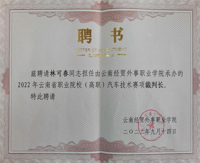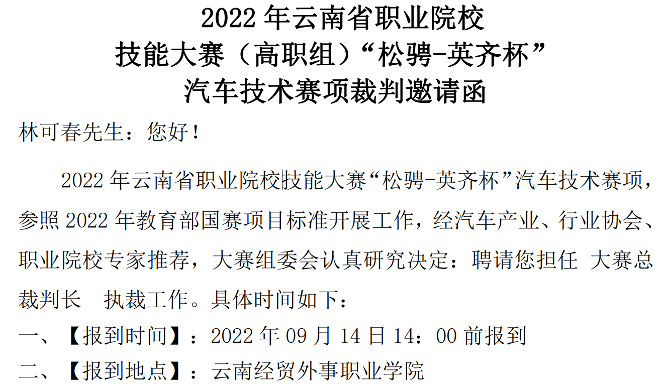 2022年云南省職業(yè)院校技能大賽“汽車技術(shù)”賽項(xiàng)于2022年09月16日至2022年9月18日在云南經(jīng)貿(mào)外事職業(yè)學(xué)院舉辦。經(jīng)全國汽車職業(yè)院校(高職組)教師、行業(yè)協(xié)會(huì)等專家推薦,受云南省職業(yè)院校大賽組委會(huì)的邀請、林可春技能大師擔(dān)任本次大賽總裁判長進(jìn)行執(zhí)裁工作。