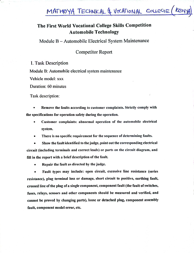 2022年8月12日,首屆世界職業(yè)院校技能大賽“汽車技術(shù)”賽項在天津開賽。賽項首次創(chuàng)新組隊模式,采取“1+1”手拉手中外聯(lián)合組隊,并設(shè)立以天津交通職業(yè)學院為主賽場和其余8個分賽場的線上線下競賽模式。本次比賽我校的沈洪松和劉建輝以及肯尼亞Mathioya Technical and Vocational College的Godffrey Gathungu和Emeldah Wakarindi聯(lián)合組隊,在比賽中取得了第四名的優(yōu)異成績。