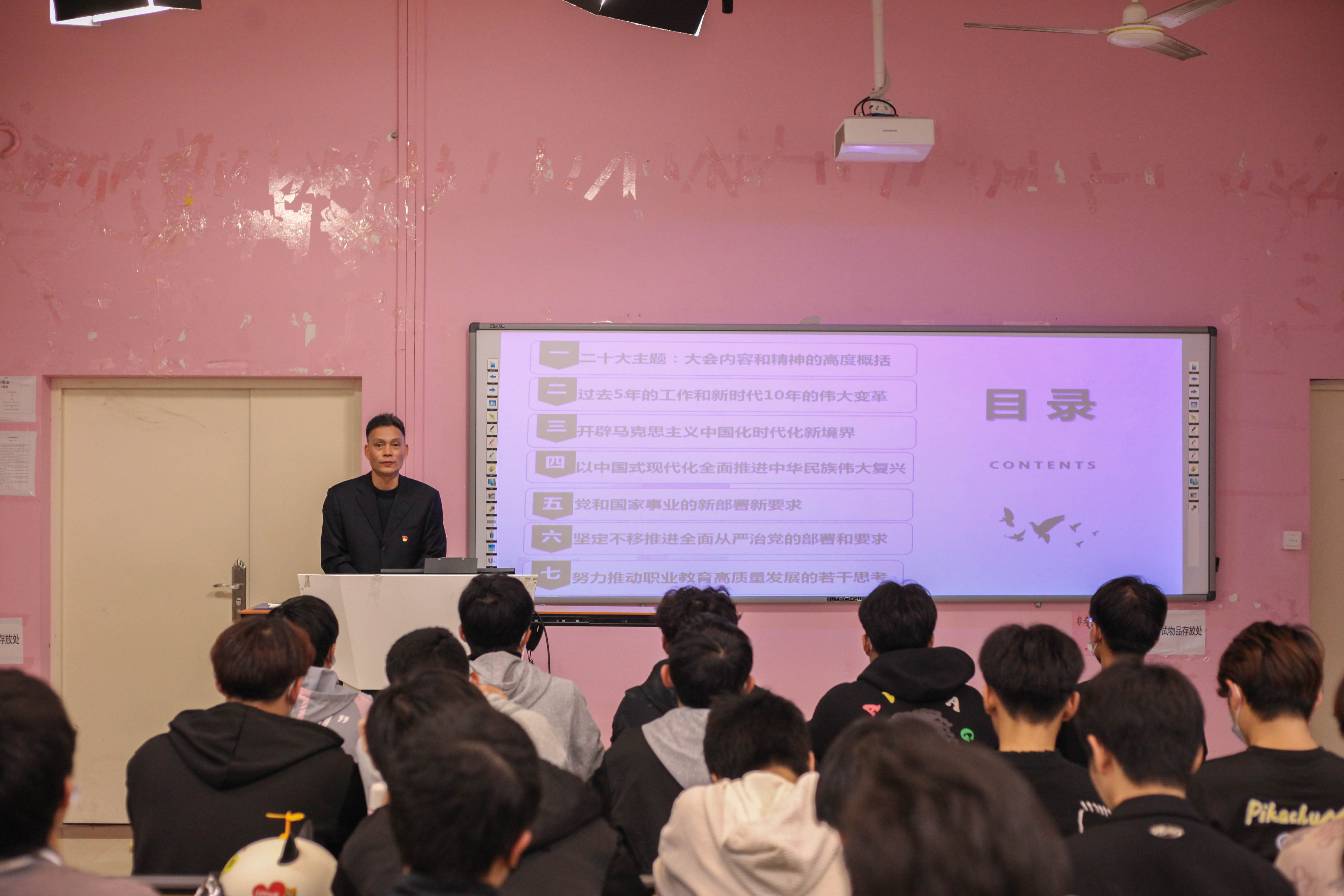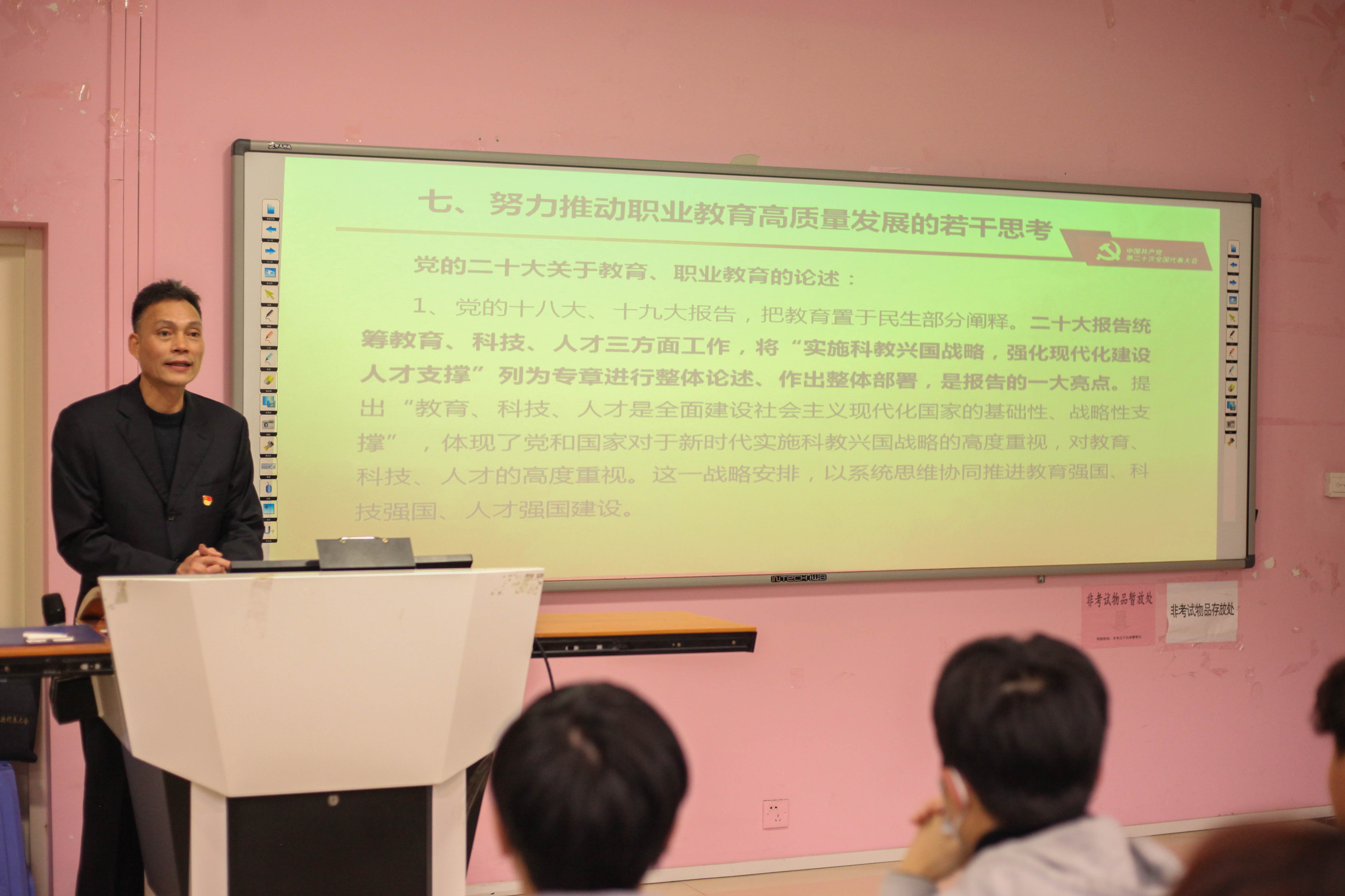 蔡華錦書記從“黨的二十大主題:大會(huì)內(nèi)容和精神的高度概括”、“過(guò)去5年的工作和新時(shí)代10年的偉大變革”、“開辟馬克思主義中國(guó)化時(shí)代化新境界”、“以中國(guó)式現(xiàn)代化全面推進(jìn)中華民族偉大復(fù)興”、“黨和國(guó)家事業(yè)的新部署新要求”、“堅(jiān)定不移推進(jìn)全面從嚴(yán)治黨的部署和要求”、“努力推動(dòng)職業(yè)教育高質(zhì)量發(fā)展的若干思考”七個(gè)方面展開宣講。引導(dǎo)青年學(xué)生們對(duì)中國(guó)式現(xiàn)代化知其然、知其所以然,弘揚(yáng)偉大建黨精神,自信自強(qiáng)、守正創(chuàng)新,踔厲奮發(fā),勇毅前行,以更飽滿的精神面貌貢獻(xiàn)自己的青春力量。