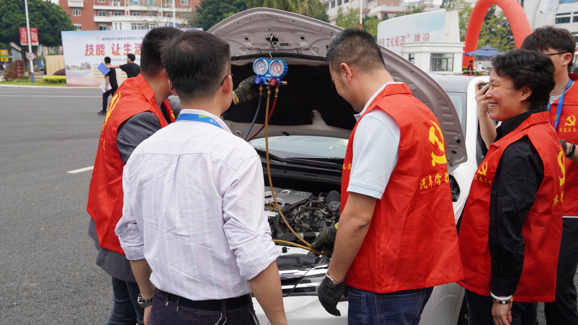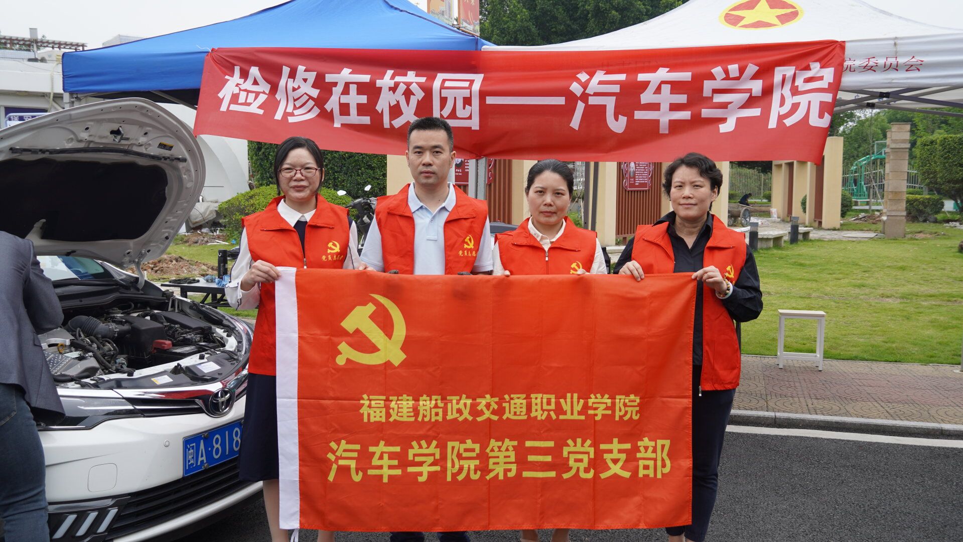 為深入學(xué)習(xí)貫徹黨的二十大精神,積極踐行“為民服務(wù)”初心,2023年5月14日汽車學(xué)院第三黨支部黨員書記朱劍寶同志利用職教周校園開放日,組織黨員教師,帶領(lǐng)學(xué)生一起在福建船政交通職業(yè)學(xué)院北區(qū)籃球場旁開展志愿服務(wù),免費(fèi)為群眾檢修保養(yǎng)汽車。