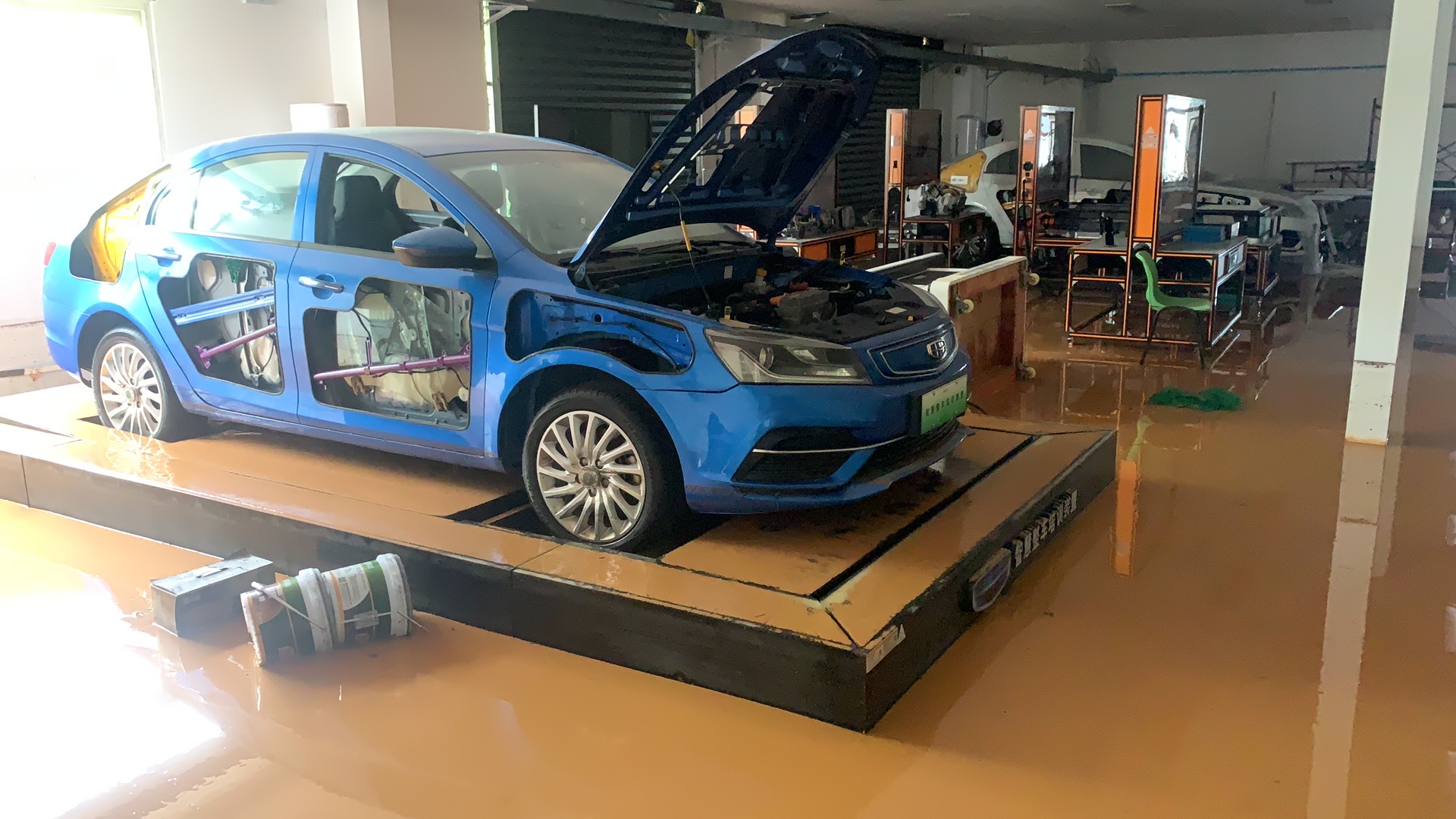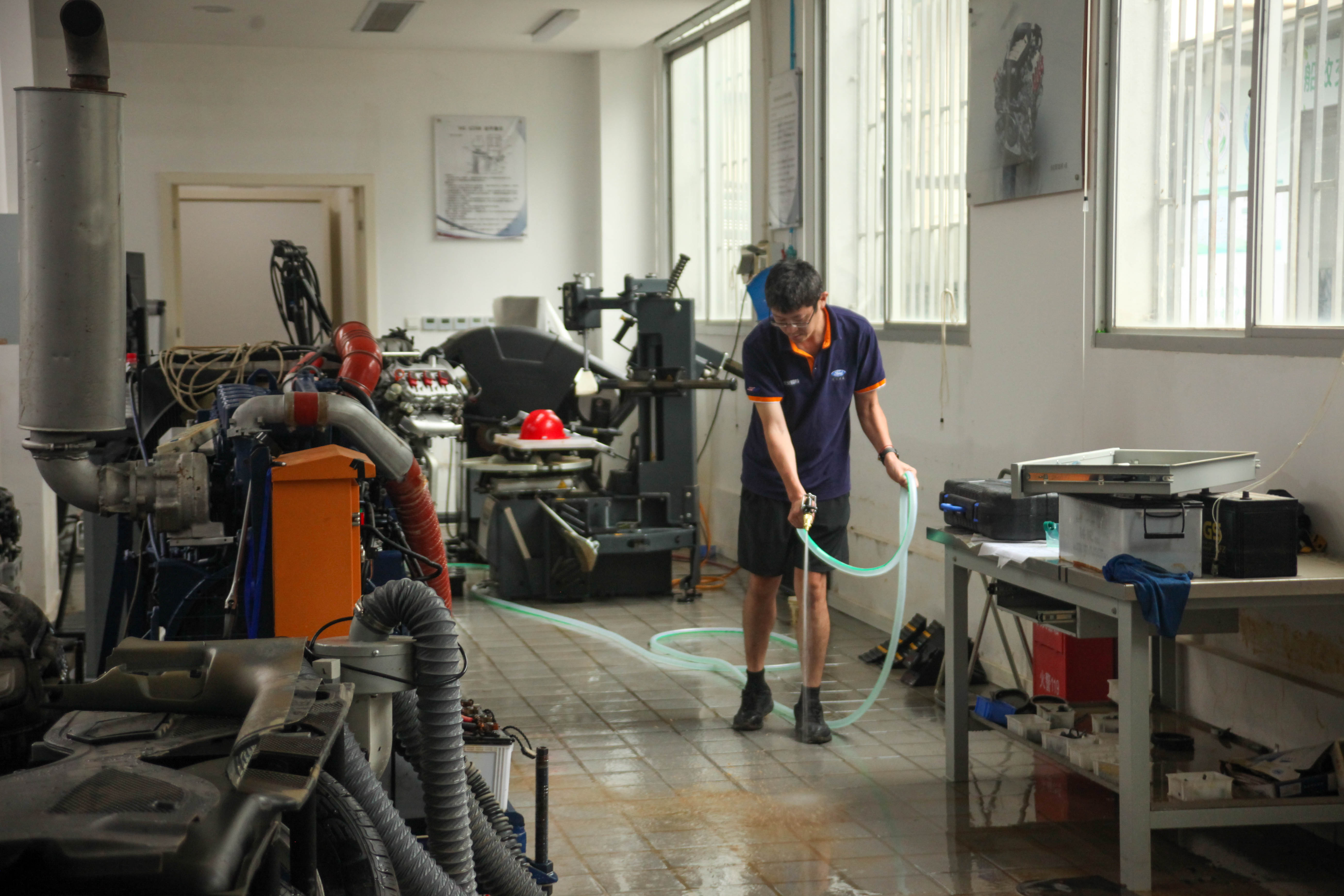 相比較于北區(qū)的校園,中區(qū)的實(shí)訓(xùn)室因地勢低下,遭遇更為嚴(yán)重的積水和淤泥堆積,清潔工作也面臨更高難度。為盡快開展實(shí)訓(xùn)室的災(zāi)后修復(fù)工作,汽車學(xué)院黨總支守土盡責(zé),迅速組織好全體教職工,劃好責(zé)任田,明確任務(wù)分工。黨政領(lǐng)導(dǎo)班子深入到一線,老師、黨員學(xué)生、廣大青年志愿者們積極參與,大家擼起袖子干了起來……