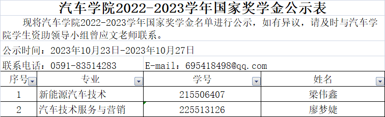 汽車學(xué)院2022-2023學(xué)年國家獎(jiǎng)學(xué)金公示表