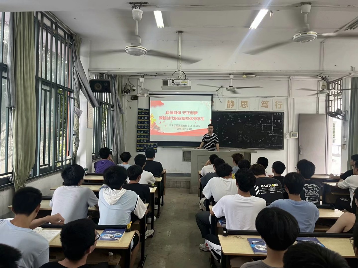 按照汽車學(xué)院黨總支關(guān)于學(xué)習(xí)貫徹習(xí)近平新時代中國特色社會主義思想主題教育工作要求和部署,2023年5月17日汽車學(xué)院第三黨支部書記朱劍寶同志在8#219教室給汽車學(xué)院學(xué)生入黨積極分子上專題黨課,主題為“自信自強(qiáng)、守正創(chuàng)新——做新時代職業(yè)院校優(yōu)秀學(xué)生”,汽車學(xué)院學(xué)生入黨積極分子參加。