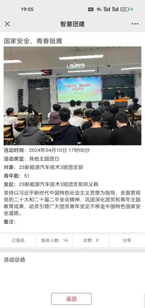 各團支部結合智慧團建系統(tǒng),通過線上線下雙渠道組織班級同學參與學習,以觀看視頻、PPT國家安全知識講解、案例分析和同學之間互動討論等多種形式,引導團員和青年們深入了解國家安全的基本內(nèi)涵,當前面臨的復雜形勢以及在維護國家安全中的責任與擔當。深刻體悟到維護國家安全,每個人都不是局外人,每個人都應是參與者、踐行者的思想自覺,攜手共筑國家防線。