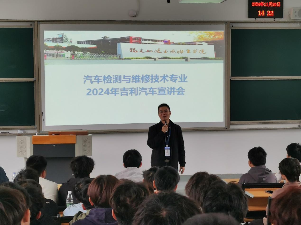 為進(jìn)一步推進(jìn)校企合作,提高人才培養(yǎng)質(zhì)量,拓展畢業(yè)生就業(yè)渠道。2024年11月20日,汽車學(xué)院在8號樓三階教室舉行了吉利訂單班專場宣講會。吉利汽車校企合作企業(yè)代表、汽車學(xué)院院長蘇慶列、汽車檢測與維修技術(shù)專業(yè)主任曾雪蓮、吉利校企合作項目負(fù)責(zé)人呂翱、專任教師張光葳出席本次會議,汽車學(xué)院2024級汽車檢測與維修技術(shù)專業(yè)學(xué)生等共計100余人參加此次會議。