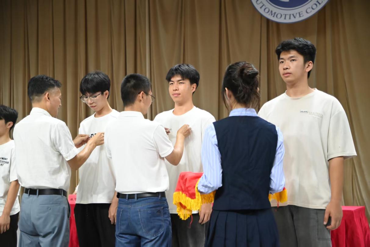 宣誓完畢,學(xué)院領(lǐng)導(dǎo)為十八位班級(jí)代表授予并佩戴?;铡.?dāng)?;张宕髟谛厍暗哪且豢?,新生們臉上洋溢著自豪與喜悅,這不僅是一種身份的象征,更是一份沉甸甸的責(zé)任,激勵(lì)著他們在今后的學(xué)習(xí)生活中,以?;諡闃s耀,以學(xué)院為驕傲,不斷奮進(jìn)。