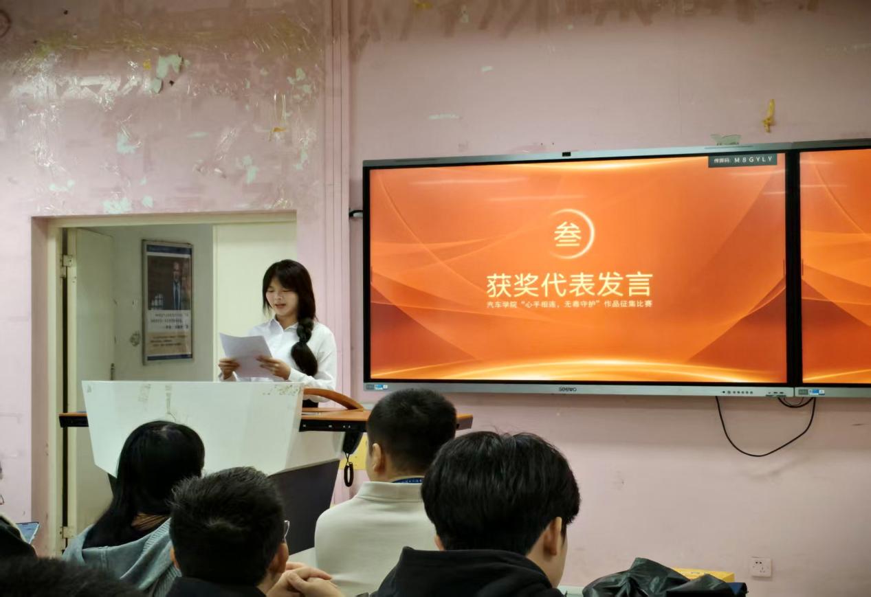 儀式的最后,由一等獎(jiǎng)獲獎(jiǎng)代表、來(lái)自25級(jí)智能網(wǎng)聯(lián)汽車技術(shù)2班的夏欣怡同學(xué)上臺(tái)發(fā)表獲獎(jiǎng)感言,她分享了自己的創(chuàng)作靈感,并想通過(guò)作品告訴大家:毒品就像一輛剎車的汽車,一旦沾染,人生便會(huì)失控,作為汽車學(xué)子,我們有責(zé)任有義務(wù)向更多人傳遞禁毒知識(shí)。