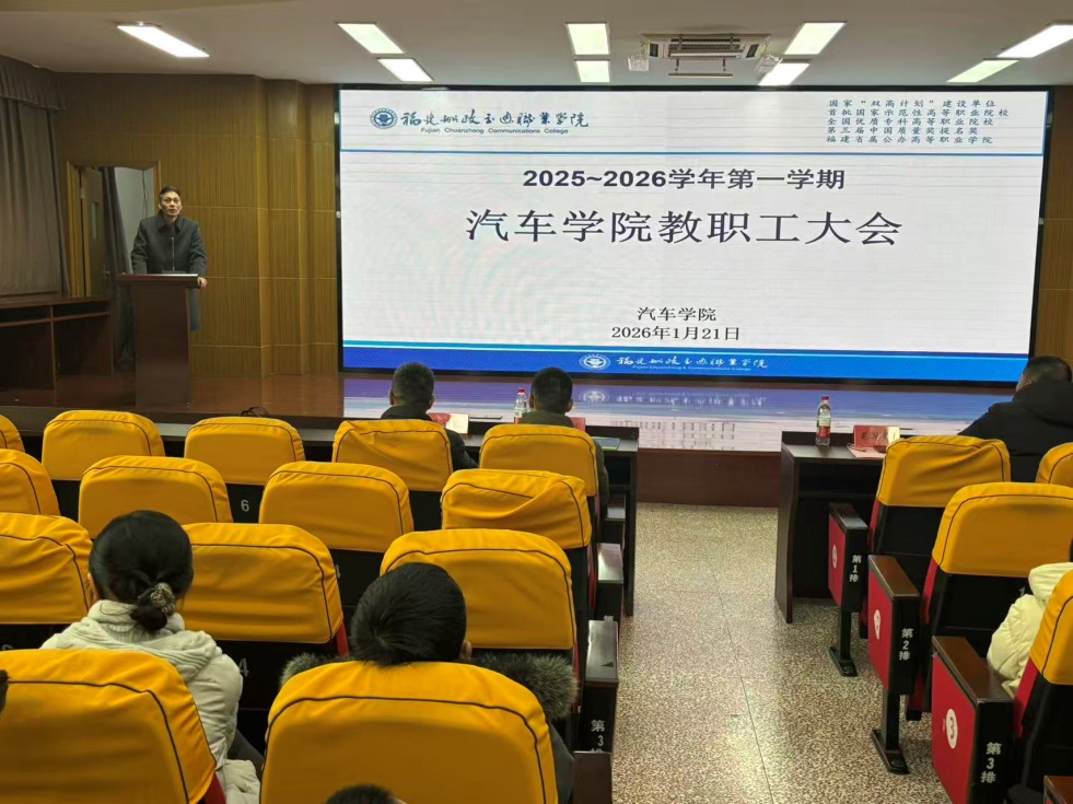 2026年1月21日,汽車學(xué)院在行政樓六樓學(xué)術(shù)報(bào)告廳召開全體教職工大會(huì),學(xué)院黨政領(lǐng)導(dǎo)及全體教職工全員參會(huì)。