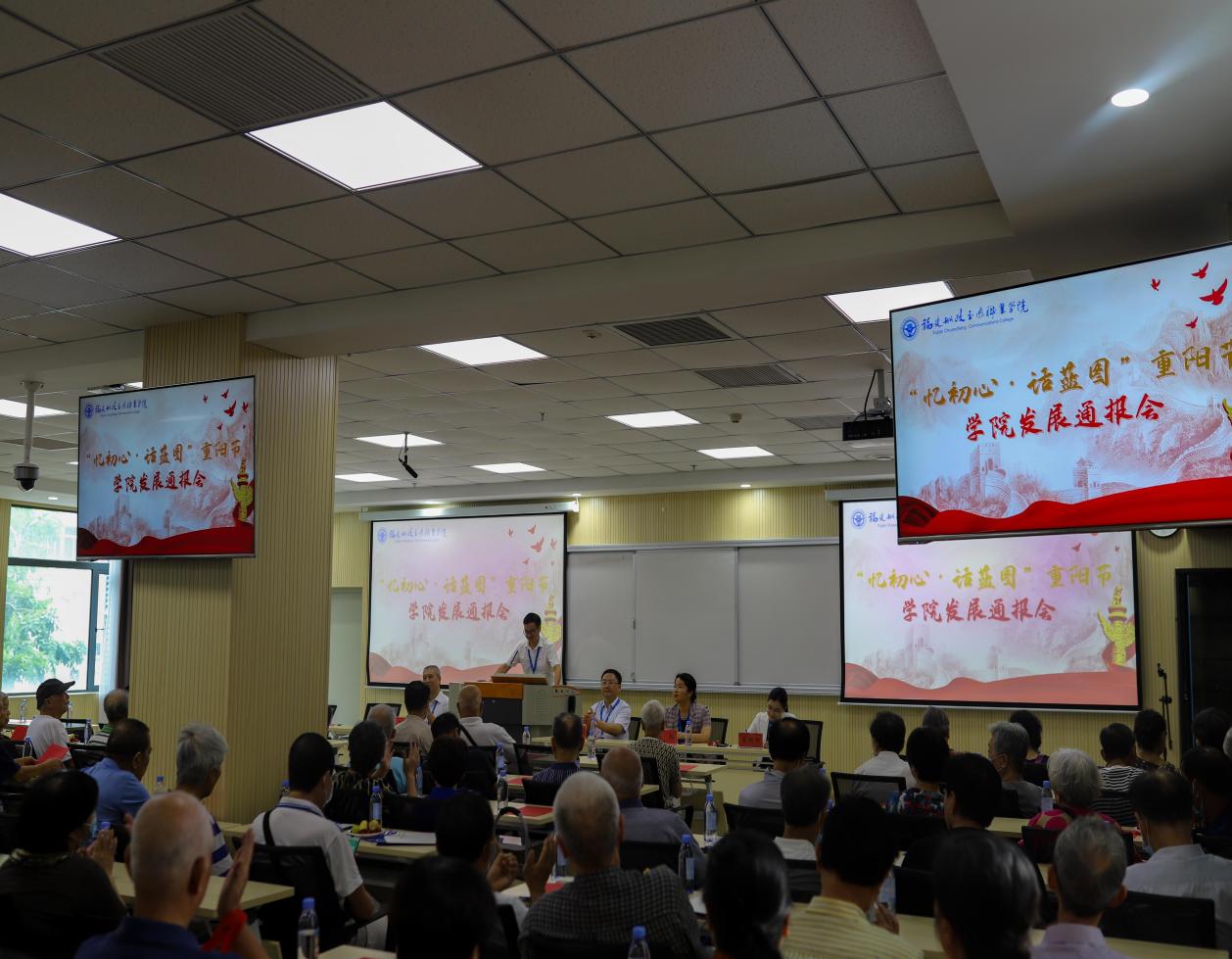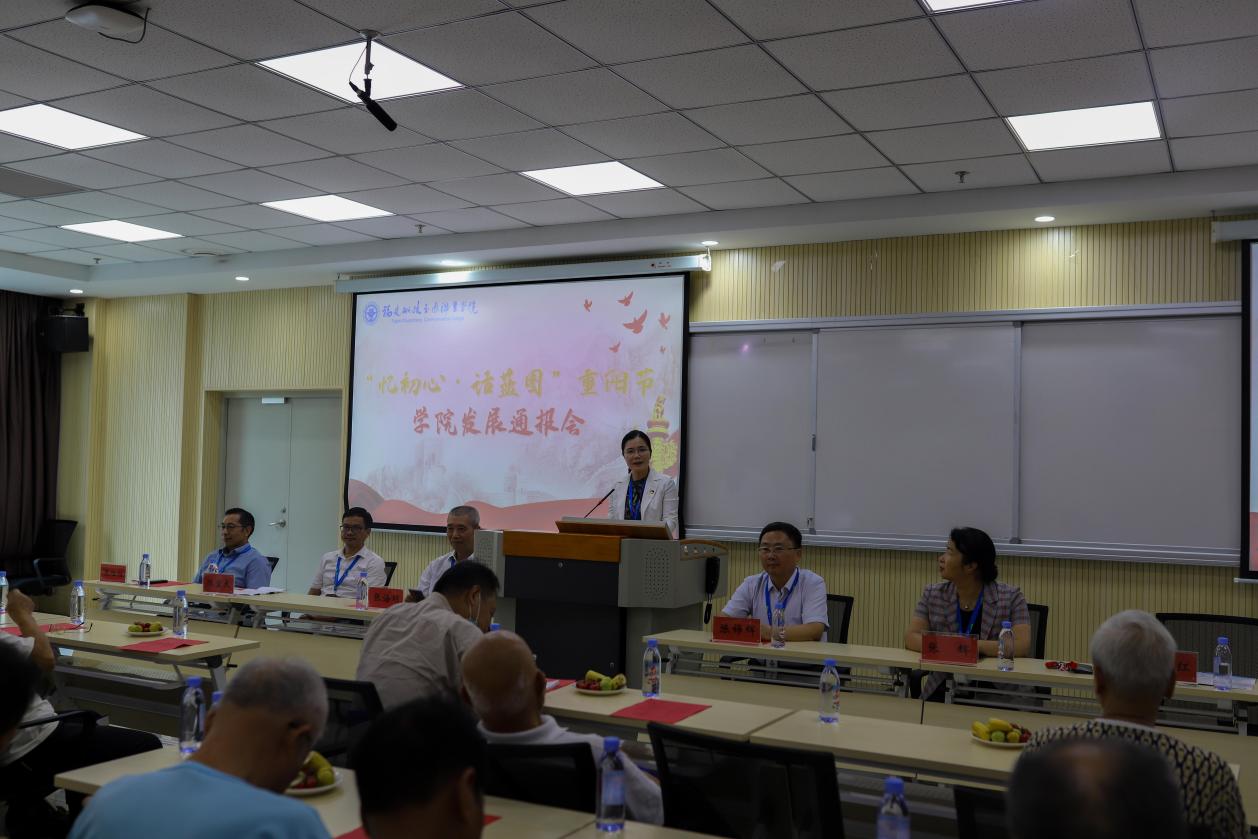 隨后,“憶初心、話藍圖”重陽節(jié)學院發(fā)展通報會在培訓學院會議室隆重召開,學院領導班子成員、職能部門負責人、離退休教師參加了大會。會議由學院黨委副書記陳宜大主持。