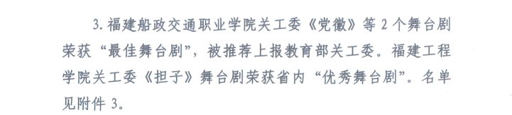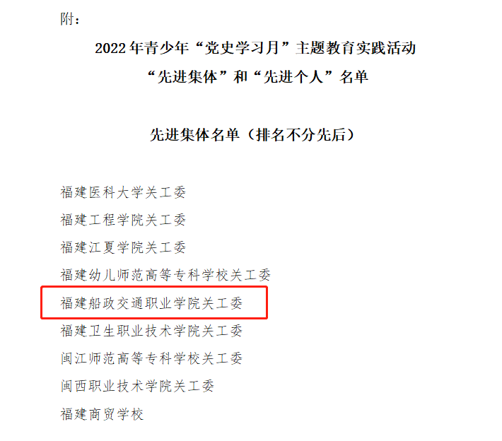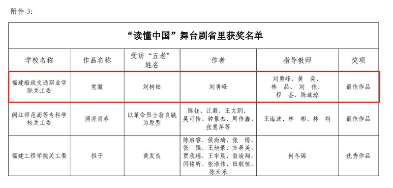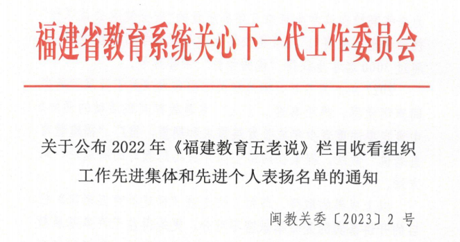 日前,福建省教育系統(tǒng)關(guān)工委公布了2022年《福建教育五老說》欄目收看組織工作先進集體和先進個人表揚名單、2022年青少年“黨史學(xué)習(xí)月”主題教育實踐活動“先進集體”和“先進個人”名單以及 2022 年“讀懂中國——共話百年奮斗, 爭做時代新人”舞臺劇評審結(jié)果,我校關(guān)工委榮獲先進集體2個,先進個人1名,舞臺劇《黨徽》榮獲最佳作品獎。