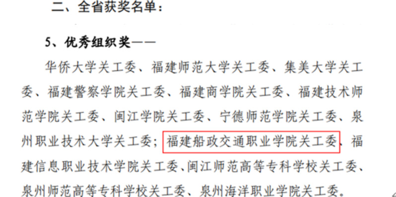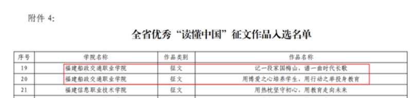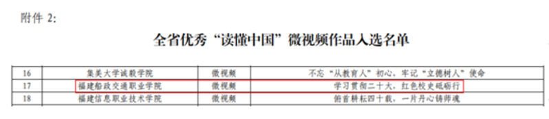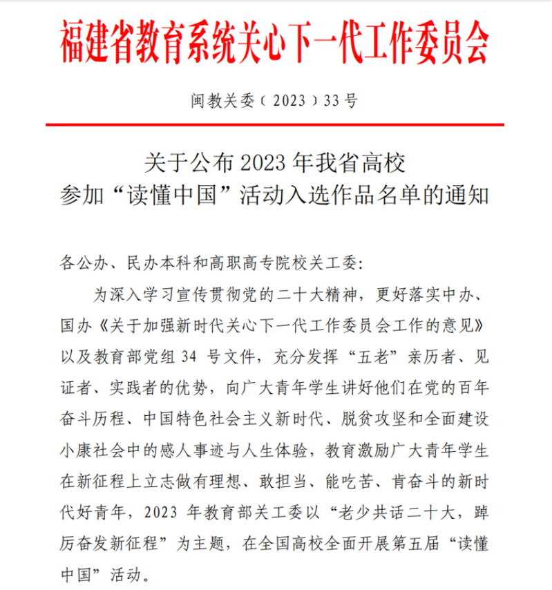 日前,福建省教育系統(tǒng)關工委公布了2023年我省高校參加“讀懂中國”活動入選作品名單,我院關工委榮獲全省優(yōu)秀組織獎,微視頻《“船”承人》成功入選全省最佳“讀懂中國”微視頻作品,《學習貫徹二十大,紅色校史砥礪行》榮獲全省優(yōu)秀“讀懂中國”微視頻作品,2篇學生征文入選全省優(yōu)秀征文作品。
