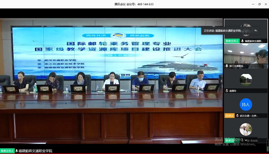 2020年7月10日,學(xué)院聯(lián)合武漢交通職業(yè)學(xué)院和浙江交通職業(yè)技術(shù)學(xué)院共同主持召開職業(yè)教育國際郵輪乘務(wù)管理專業(yè)國家級教學(xué)資源庫項(xiàng)目建設(shè)工作推進(jìn)大會。由于新冠肺炎疫情防控常態(tài)化的需要,本次會議在騰訊會議網(wǎng)絡(luò)平臺上召開,學(xué)院陳艷紅副院長、航海技術(shù)系江明光主任協(xié)同資源庫各課程負(fù)責(zé)人共同參會。來自行業(yè)企業(yè)的專家和各參建單位代表共計一百三十多人,以個人連線的方式加入線上會議。