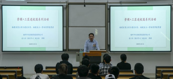 為大力弘揚(yáng)勞動(dòng)光榮、技能寶貴、營(yíng)造“勞模+工匠”精神育人的校園新文化,培養(yǎng)師生高度的文化自信和文化自覺(jué),結(jié)合安全技術(shù)與管理專(zhuān)業(yè)群實(shí)際發(fā)展需求,土木工程學(xué)院于2020年11月11日邀請(qǐng)了福州市水務(wù)投資發(fā)展有限公司總工辦副主任李濤來(lái)校開(kāi)設(shè)講座活動(dòng)。土木工程學(xué)院市政教研室全體教師、市政工程技術(shù)專(zhuān)業(yè)學(xué)生共150余人聆聽(tīng)了報(bào)告,報(bào)告會(huì)由市政教研室主任魏天云主持。