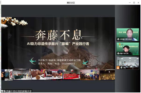 本屆大賽自啟動以來,共吸引了全國5178個鄉(xiāng)村振興創(chuàng)業(yè)項目報名參賽。大賽分為初賽、半決賽、決賽等環(huán)節(jié),通過線上項目資料評審、現(xiàn)場路演答辯等方式進行。我院“《奔藤不息》AI助力非遺‘藤編’產(chǎn)業(yè)振興引領者”項目在張?zhí)煨恰⒍螀怯?、許友孝和雷筱珍老師精心指導下成功入圍現(xiàn)場半決賽,喜獲銀獎。