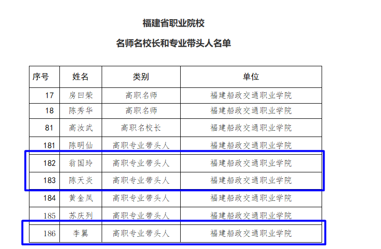 近日,《福建省教育廳關(guān)于公布職業(yè)院校名師名校長和專業(yè)帶頭人名單的通知》(閩教師〔2023〕75號(hào))印發(fā),經(jīng)省教育廳遴選、培養(yǎng)、結(jié)業(yè)考核、專家綜合考評(píng)和公示,航海技術(shù)專業(yè)群翁國玲、陳天炎、李翼被確定為福建省高職院校專業(yè)帶頭人。