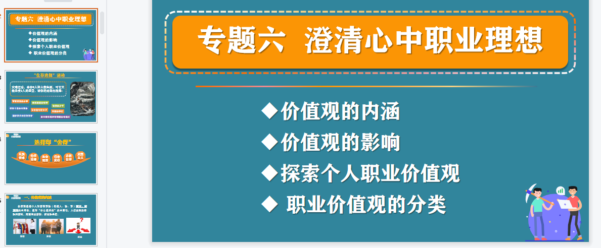 首先由黃其連老師詳細(xì)介紹《專題六 澄清心中職業(yè)理想》共2課時的整體教學(xué)設(shè)計。