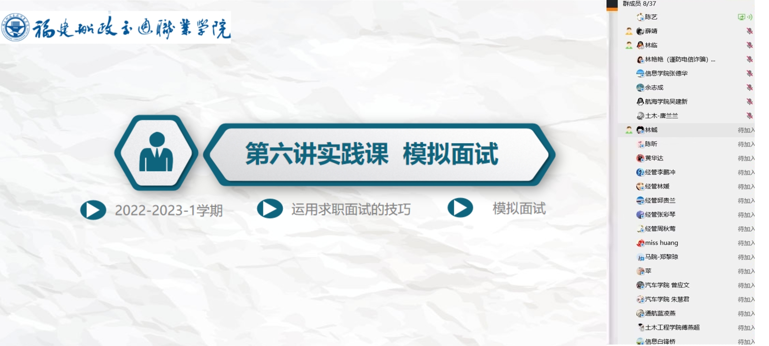 8月13日,馬克思主義學院就業(yè)與創(chuàng)業(yè)教研室按計劃舉辦了本學期第六次線上集體備課活動。本次活動由就業(yè)與創(chuàng)業(yè)教研室主任薛靖老師主持,由老師陳藝主講,其他講授本課的專兼職教師共同參與,本次備課主題為“第六講 求職技巧 實踐課--模擬面試”。